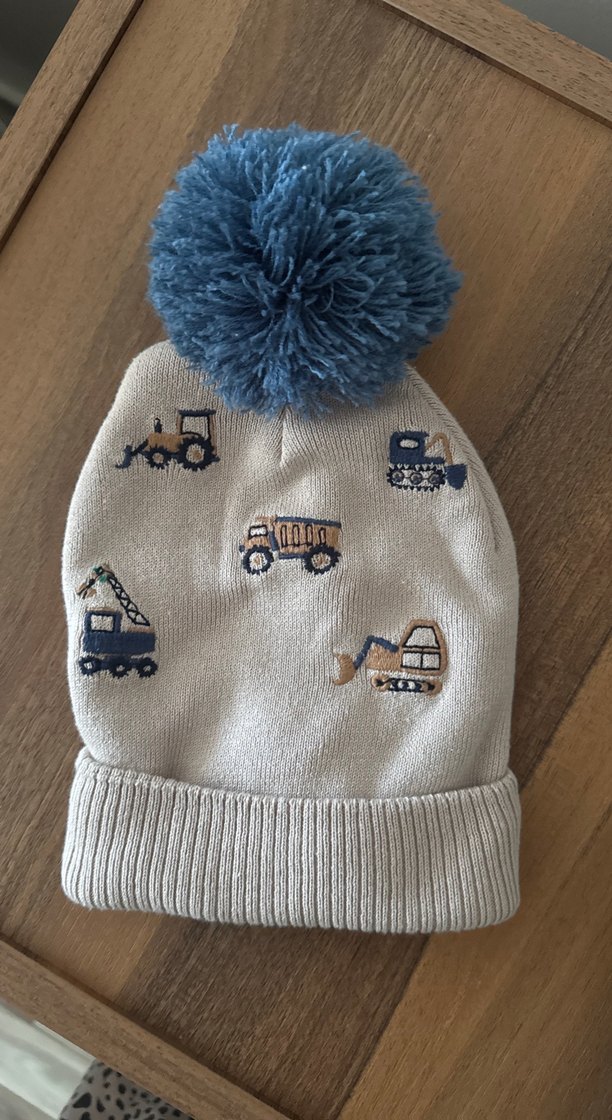 Nakışlı inşaat araçları ve büyük mavi ponponlu gri örgü erkek çocuk bere. Katlanabilir kenarı ve yumuşak dokusu vardır.