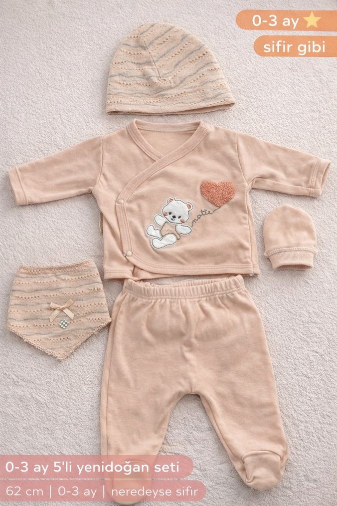 0-3 ay bebekler için pastel bej renkte, nakışlı ve dantelli 5 parçalı yenidoğan seti. Yumuşak kumaş ve sevimli ayıcık detaylıdır.