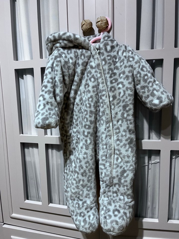 Gri renkte, leopar desenli ve kürk detaylı kapüşonlu bebek tulumu.