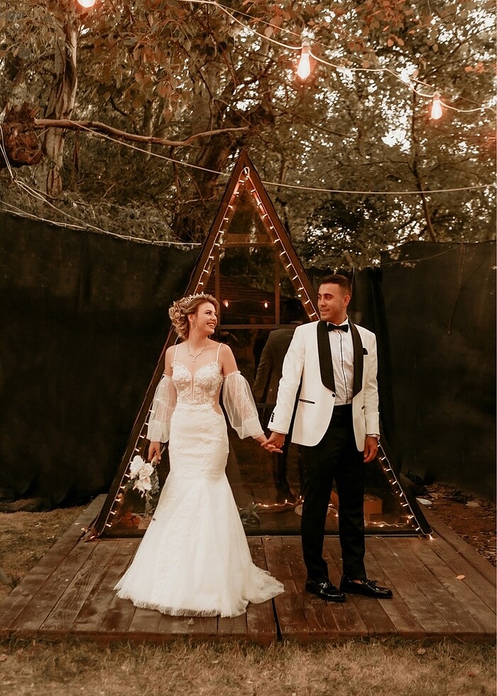 Tak çıkar kuyrugu özel çiçek işlemeli duvak ve eldivenleri ile satılıktır . Özel kılıfı ile saklanmaktadır. Evimde yer olmadığı ve ilerde içine sığabilecek kadar zayıf olamayacagım için satıyorum