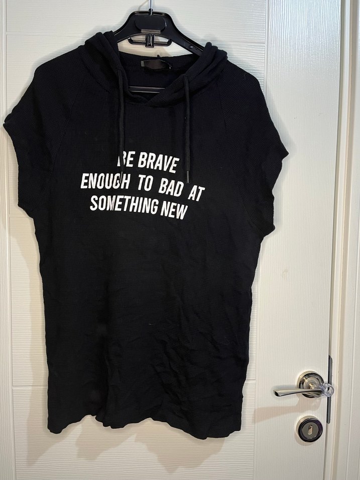 Kısa kollu, kapüşonlu siyah sweatshirt, bol kesim ve baskılı yazı detaylı. Ürün m bedendir. Pötikare desenli bir kumaşa sahiptir. Hiç giyilmemiştir ancak etiketi yoktur. Ürünler fotoğraflarda ütüsüzdür, ütülenip gönderilecektir.
