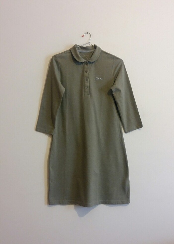 bebe yaka truvakar kol orta tonlu haki renk kol spor elbise. sık dokulu kumaş. iç göstermez. hiç giyilmedi. hiç yıkanmadı. katlanıp dolaba kaldırıldı. göğüs 47 cm boy 86 cm kol boyu 46 cm