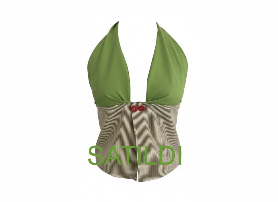 Üst kısmı çift kat kumaş Alt kısmı yeşil beyaz çizgili kumaş Dekoratif kırmızı düğme detaylı S beden Boyundan askılı