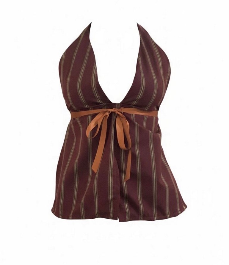 Boyundan bağlamalı, kurdelesi yanından başlayıp arkasından dolanarak önünde oluşuyor. Boynundaki askısı asıl kumaşından. S beden uyumlu. Göğüs kısmı çift kat kumaş iç göstermez. #vintage #Y2K