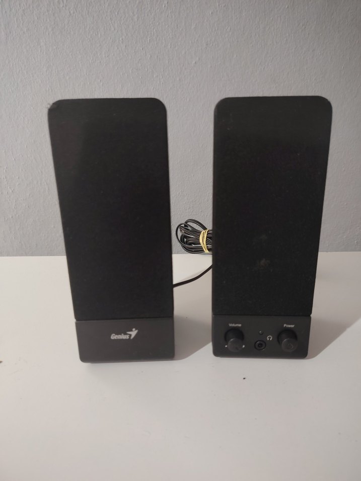 1+1 pc vs sorunsuz haporlör, Ses ve güç kontrol düğmeleri bulunan siyah Genius masaüstü hoparlörler. Kompakt tasarıma sahiptir.