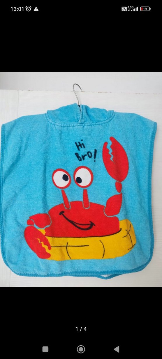 1-2 yaş panço havlu. biz 3 yaşın yazında da kullandık. kullanışlı yumuşak güzel kurulayan bir havlu. Mavi renkte, kapüşonlu ve renkli yengeç baskılı çocuk havlusu. Üzerinde "Hi Bro!" yazısı bulunur.