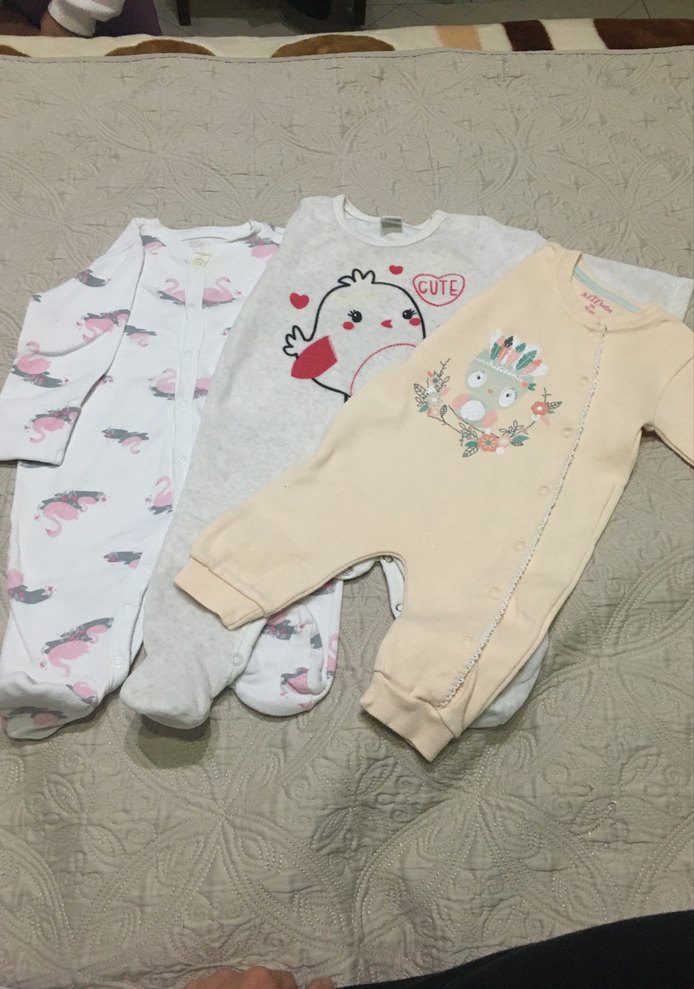 İkisi lcw, biri aziz bebe 3 adet tulum. Fotoğraflarda ortada olan kadife kumaştır. KuğuLu ve civciv desenli olanların yaka kısmında lekeler vardır. Aziz bebe olan patiksizdir ve leke yoktur. 3 lü fiyatıdır.