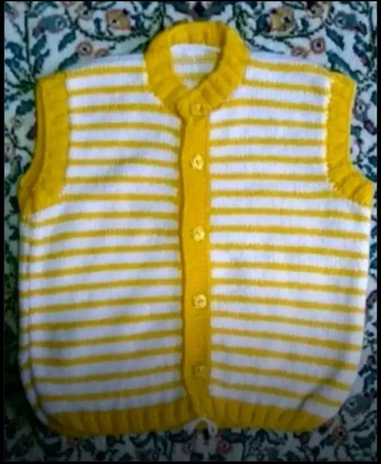 YÜN İPLİKLE ÇOK ŞIK VE MUNTAZAM DOKUNMUŞ 1-3 YAŞ GRUBU SARI BEYAZ ÇİZGİLİ SEWİMLİ YÜN YELEK... SIFIR KULLANIM ÜRÜNDÜR... GERİ İADE KABUL ETMİYORUZ...