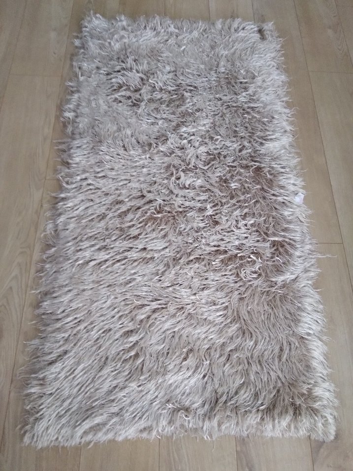 Sütlü kahve renginde bohem tarzda, desensiz ve uzun tüylü yumuşak dokulu halı çok az kullanılıp kaldırıldı kuru temizlemesi yapıldı,Boyu 1.46 cm Eni 74 cm