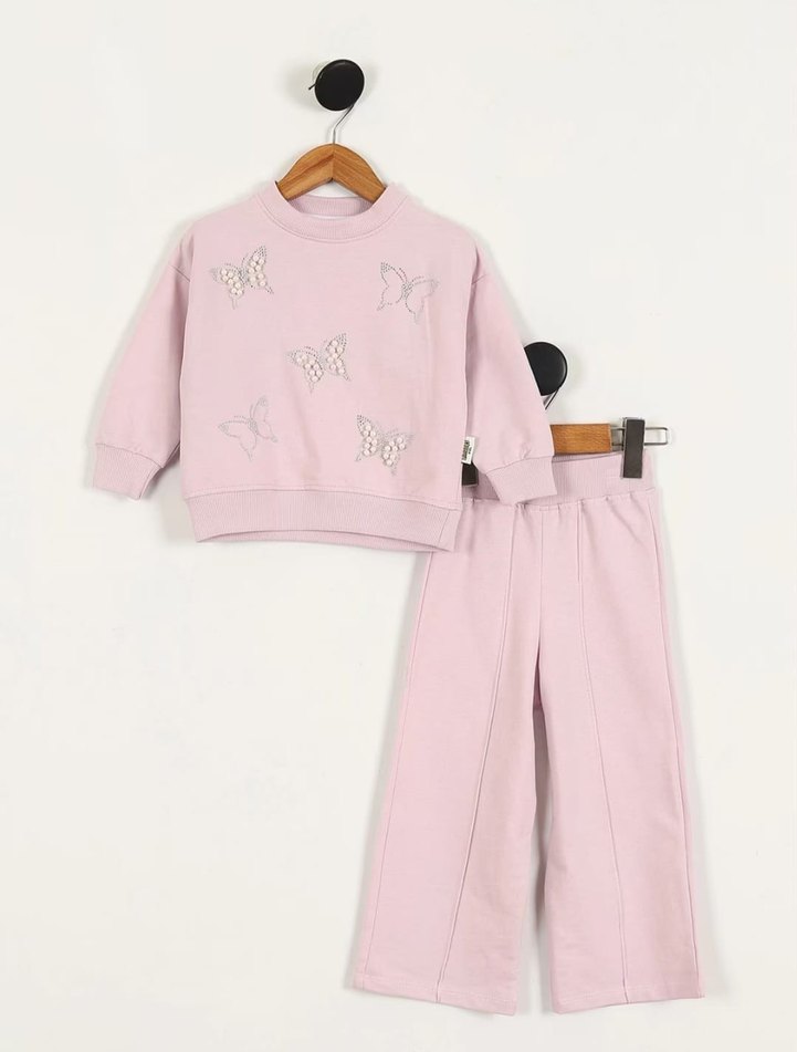 Nakışlı kelebek desenli, pastel pembe renkli, örgü uzun kollu üst ve pantolondan oluşan kız bebek takımı.