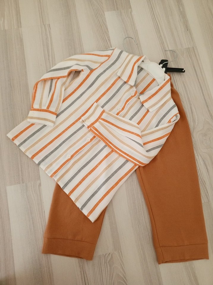 Uzun kollu, düğmeli ve yakalı çizgili gömlek ile bej renkli düz pantolondan oluşan yumuşak sentetik kumaş takım