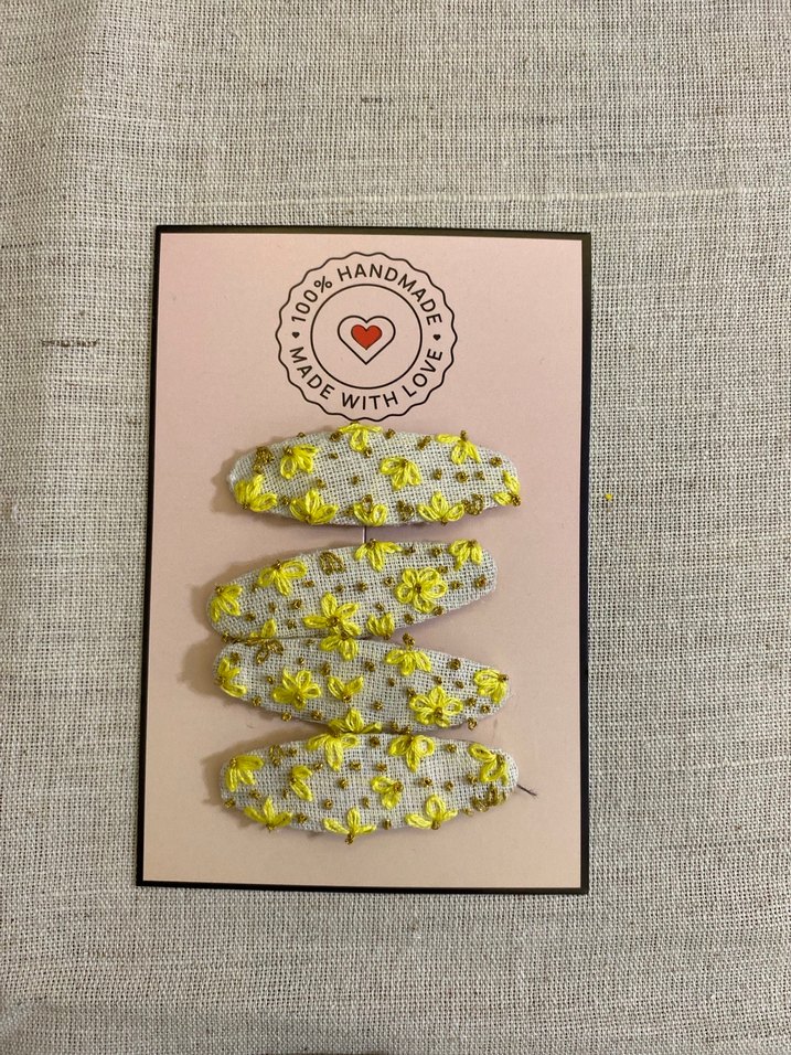 kumaş üzerine sarı nakışlı çiçekler ve boncuk detaylı, el yapımı dört adet çocuk saç tokası seti. Bohem tarz için uygun.