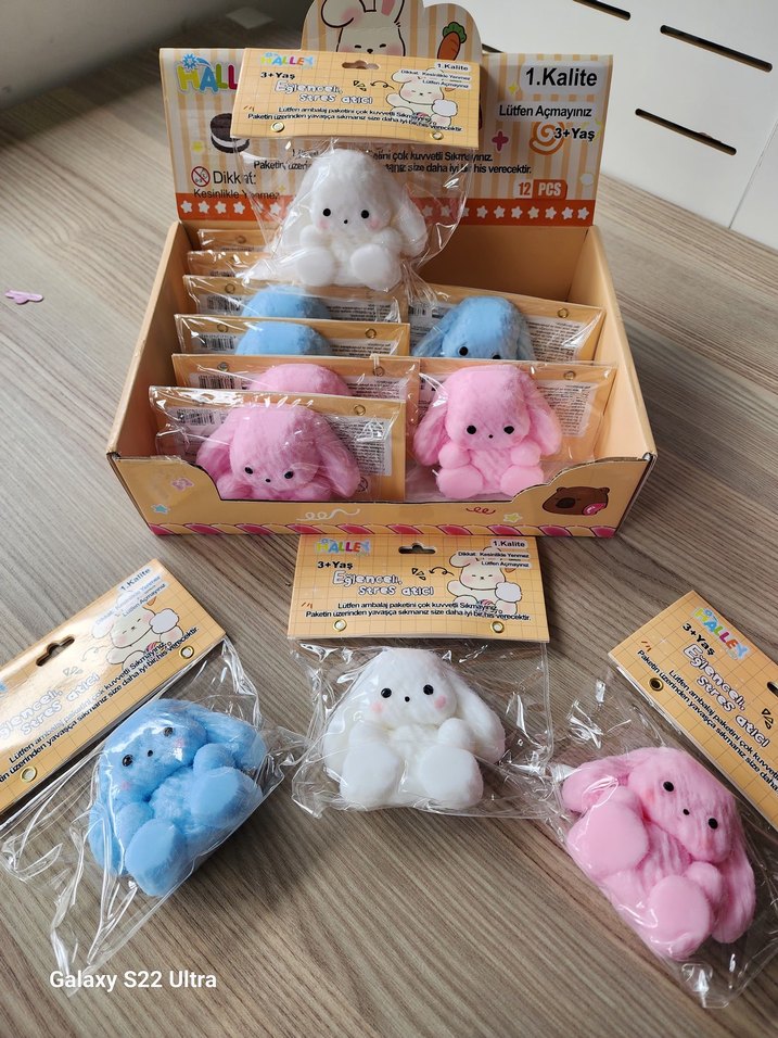 Beyaz, mavi ve pembe pastel renklerde yumuşak Sukuşi moj moj tavşan oyuncaklar, tek tek paketlenmiş. 3 yaş ve üzeri çocuklar için uygundur.