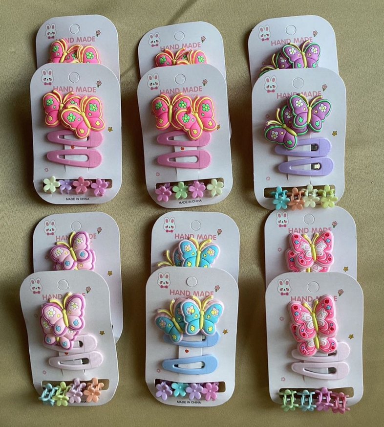 Renkli, işlemeli kelebek figürlü tokalar ve küçük çiçek tokalarından oluşan bohem tarzı set.