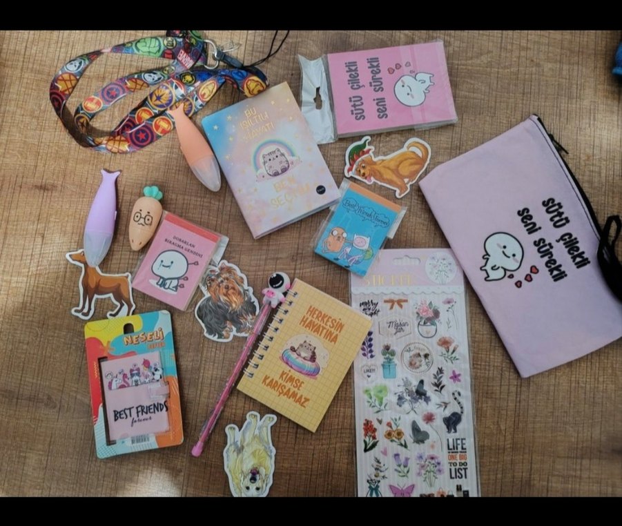 1 kaşık hediyelik en az 15 ürün.Pastel pembe planlayıcı ve çeşitli sevimli çıkartmalar, renkli ve eğlenceli tasarımlar içerir. 'ST.FRIENDS' ve 'KAD' yazılı ürünler bulunur. ️