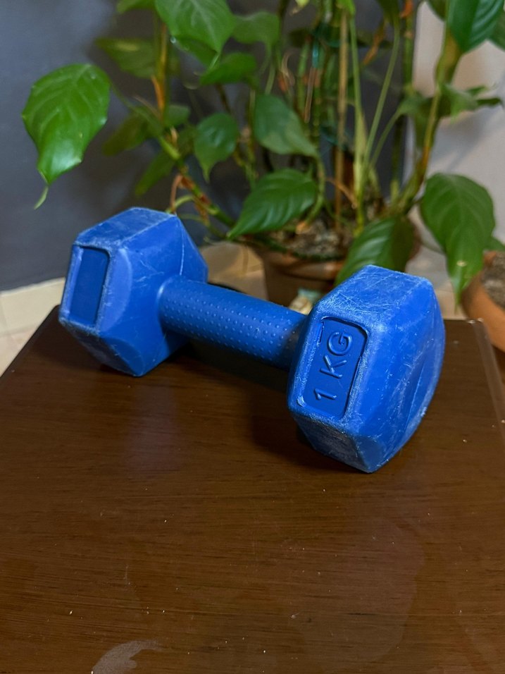Koyu mavi renkte, 1 kg ağırlığında, desen içermeyen dambıl, hafif egzersiz ve kuvvet çalışmaları için uygundur. ️♂️
