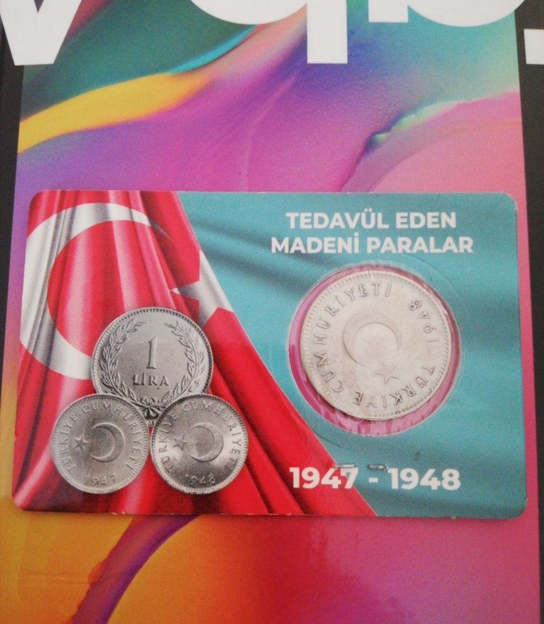 1947-1948 dönemine ait madeni paraların görselleri ve Türk bayrağı detayları içeren kırmızı zeminli vintage rozet.
