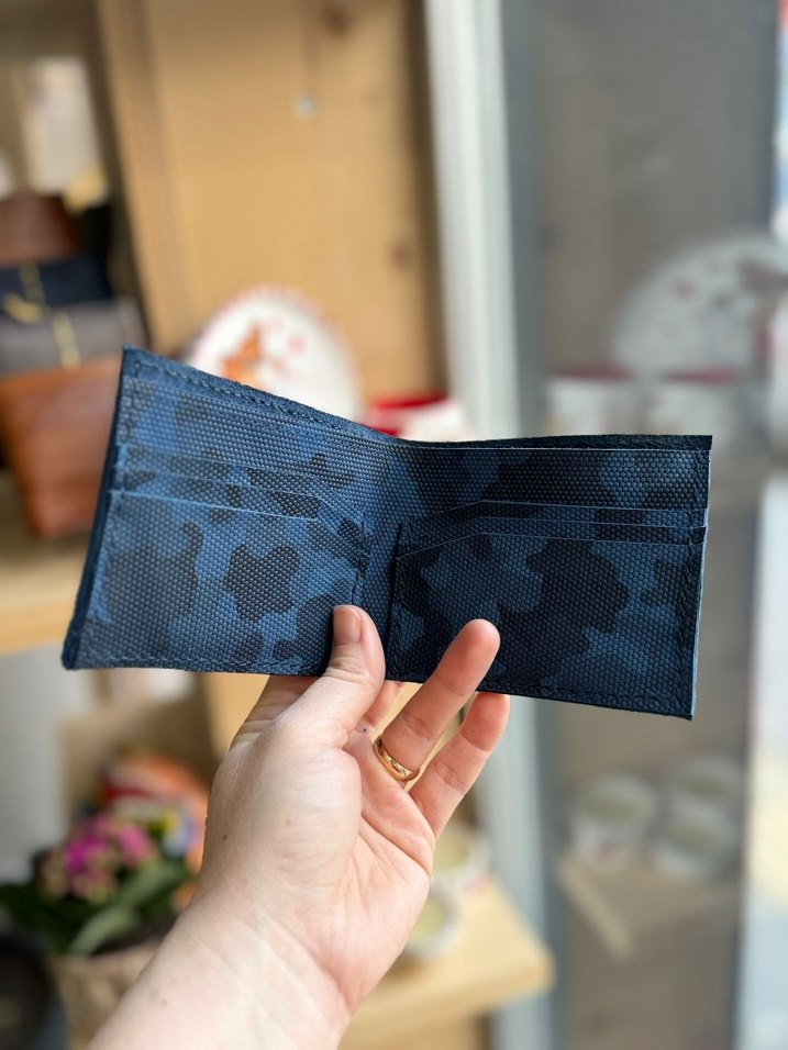 Koyu mavi kamuflaj desenli erkek cüzdan, çoklu kart bölmeleri ve sade sokak stili tasarımıyla öne çıkar.