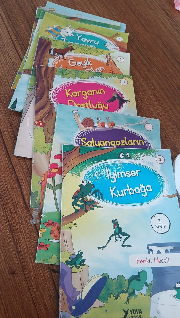 "Iyimser Kurbağa," "Salyangozların Dostluğu" gibi hikayelerin yer aldığı renkli heceli çocuk kitapları seti. 10ludur.5 numaralı kitap eksiktir.fiyat uygun tutulmuştur.