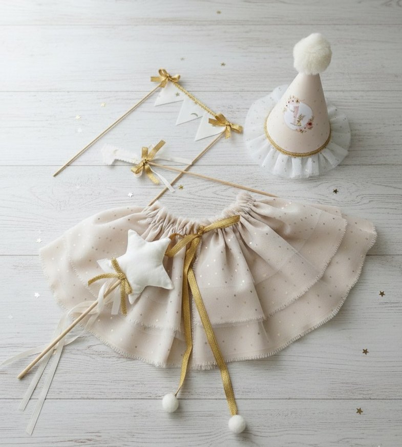 Gold detaylı tül ve pamuklu kumaştan tasarlanmıştır. Yaka pelerini Kukuleta Şapka Yıldız Asa Pasta üstü 1 rakamı Pasta üçgen flama
