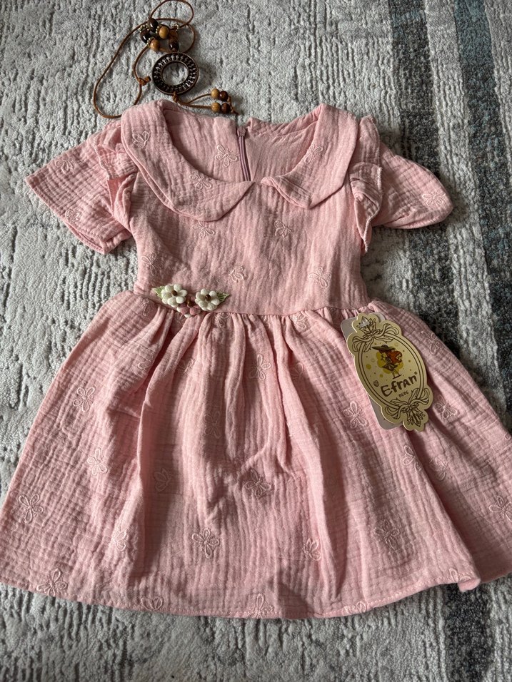 Pastel pembe müslin kumaştan, yakalı ve düğmeli, kısa kollu, nakış detaylı bol kesim kız çocuk elbisesi.