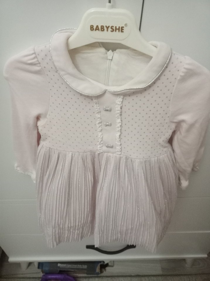 Pamuk kumaştan yapılmış, pembe, kısa kollu, yakalı,simli kız çocuk elbisesi. Az giyildi.