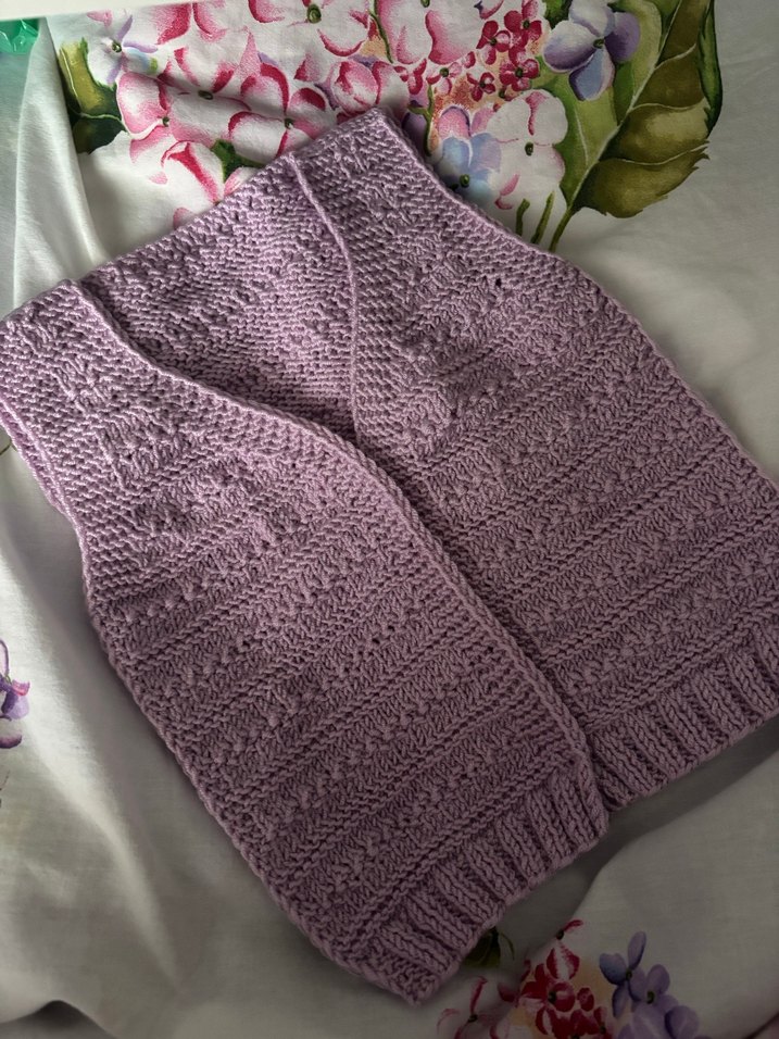 Pastel mor renkte, V yakalı, kolsuz kız çocuk yeleği. Örgü kumaştan, bol kesim ve sade, bohem tarzda üretilmiştir. El örgüsüdür sipariş olusturulmaktadır.