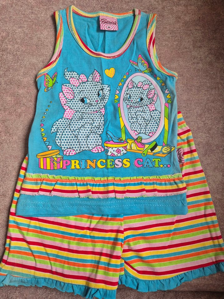 Renkli baskılı ve çizgili detaylı, straplez yakalı kız çocuk atletidir. Örme dokuma, vücuda oturan kesime sahiptir. Üzerinde "PRINCESS CAT" yazısı bulunur.