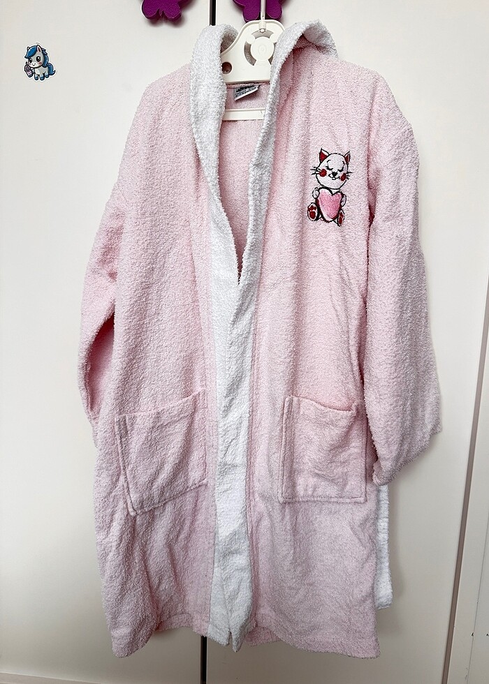 10/12 yaş Casilda Home pembe renk kız çocuk kapüşonlu bornoz.Temiz kullanıldığı için hiçbir sorunu yoktur.İki yanında cep ve belinde kemeri vardır.Önünde kedicik resmi vardır.Omuzdan uzunluğu 78 cm,koltuk altı genişliği 42 cm.#kızçocuk#pembe#bornoz#10/12yaş#kapüşonlu