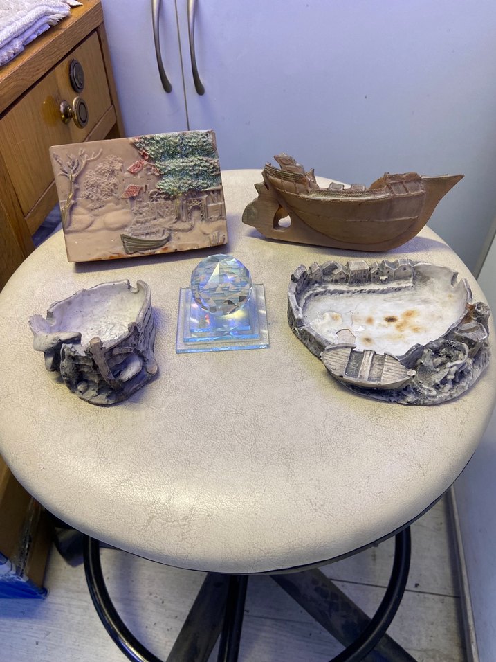 Renkli kuşlar, sarı kuş, simli top ve küçük gemi ile doğa figürlerinden oluşan oyuncak ve dekoratif figürler koleksiyonu.