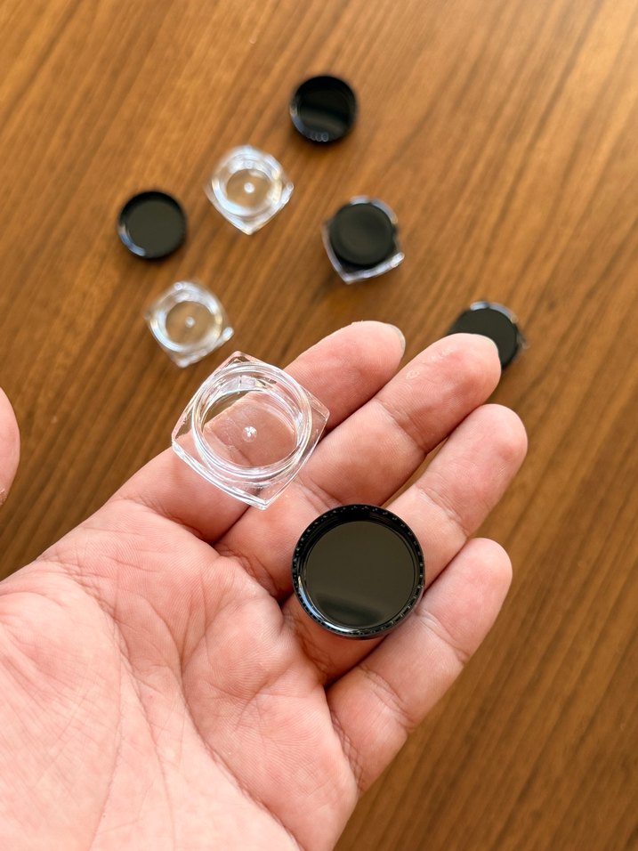 Tırnak süsleri veya küçük eşyalar için uygun, siyah plastik kapaklı küçük kutular. Şeffaf ve siyah parçalar içerir.