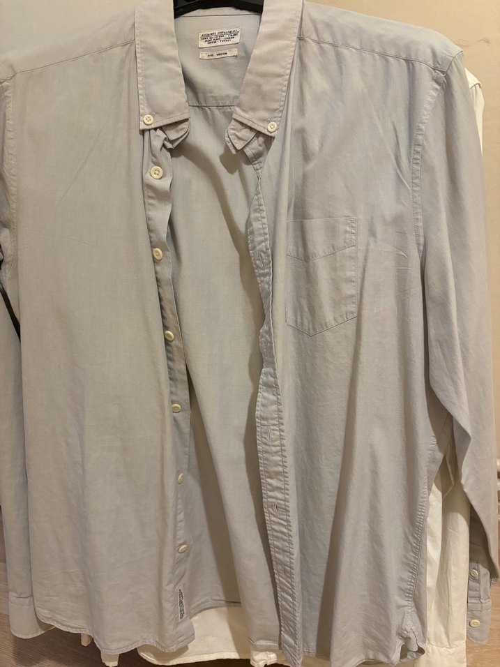 Düğmeli, keten kumaştan yapılmış gri erkek gömleği. Uzun kollu, rahat kesim ve normal boyda. Ofis ve günlük kullanım için uygundur. 10 adet M beden erkek gömlek içlerinde marka mevcuttur