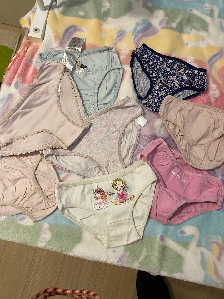 Çeşitli yumuşak kumaşlardan yapılmış, pastel tonlarda çocuk iç çamaşırı seti. Pembe ve baskılı beyaz modeller içerir.