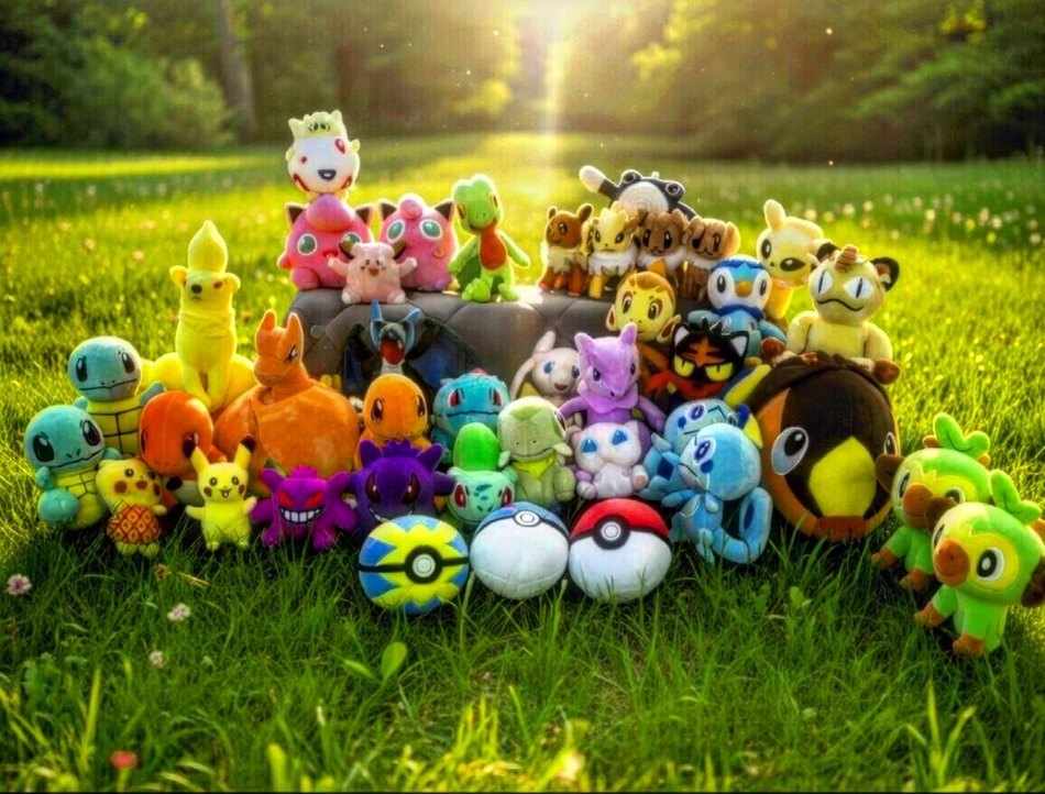 Çeşitli karakterler ve Poké Topları içeren renkli peluş oyuncak koleksiyonu, yumuşak malzemeden üretilmiştir.