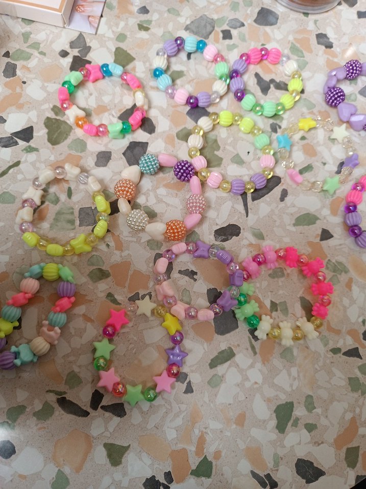 Çocuklar için renkli boncuklu bileklikler, bohem tie-dye tarzında ve canlı desenlerle. Oyunlu ve retro bir görünüm sunar. 10 adet fiyatıdır