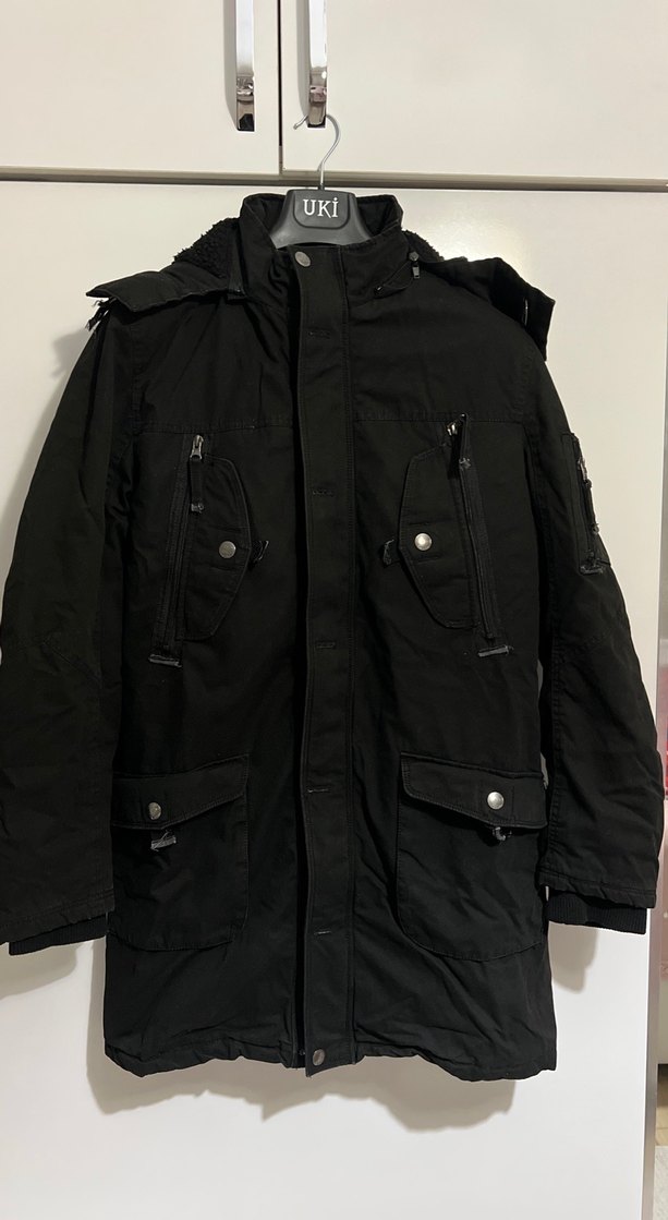 Düğmeli, normal boy midi uzunlukta siyah erkek kaban. Uzun kollu, kesikli yaka ve çok cepli, rahat kesim kumaş kullanılmış.