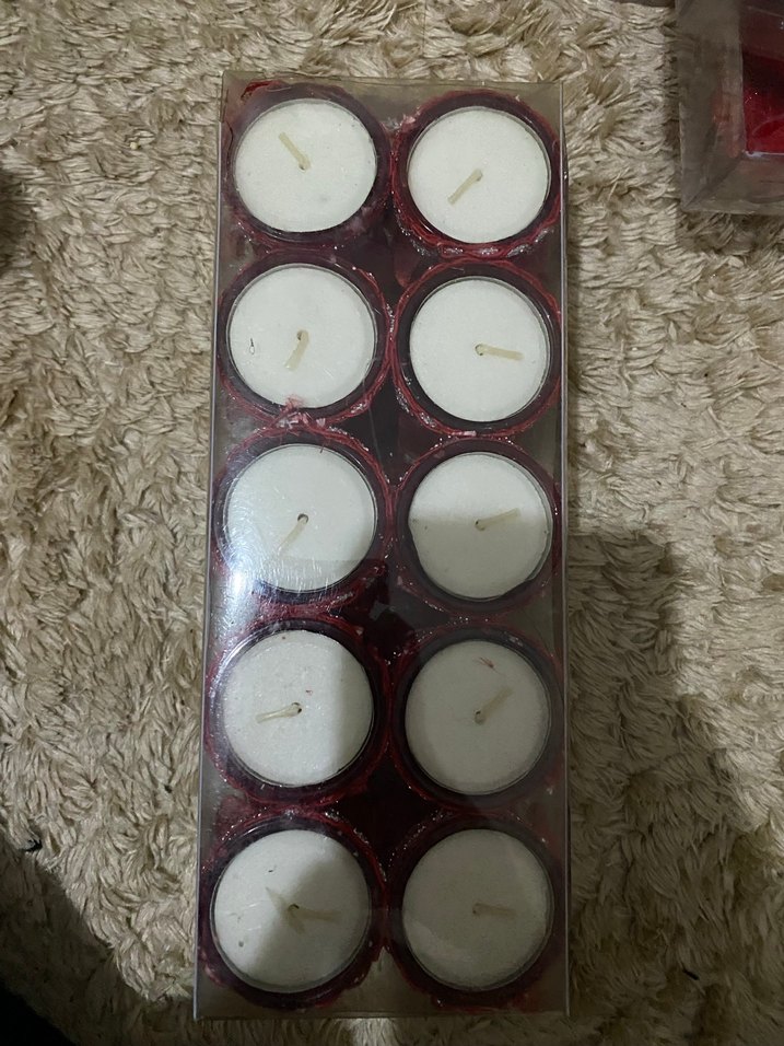 Kırmızı tutuculu 10 adet beyaz dekoratif mum seti, sıcak bir ortam yaratmak için uygundur. ️sıfır üründür