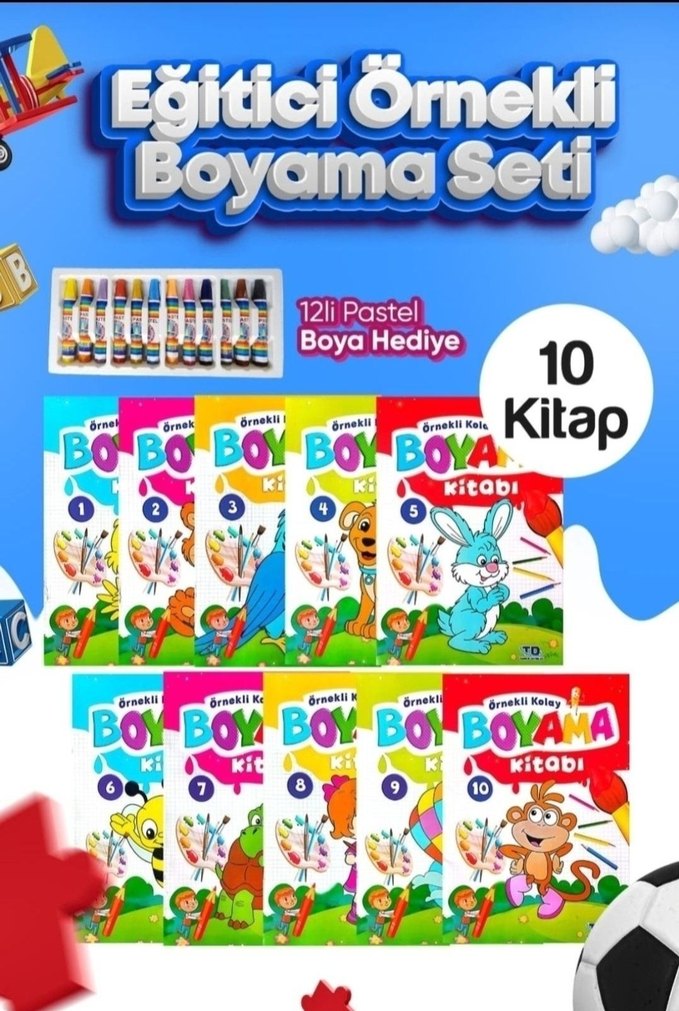 10 adet örnekli eğitici boyama kitabı ve hediye 12'li pastel boya seti içerir. Çocukların yaratıcılığını ve öğrenmesini destekler.
