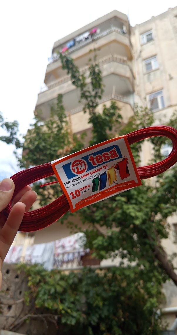 10 metre uzunluğunda, dayanıklı PVC kaplı kırmızı çamaşır ipi. Tesa markalı, sağlam ve hava koşullarına dayanıklı.