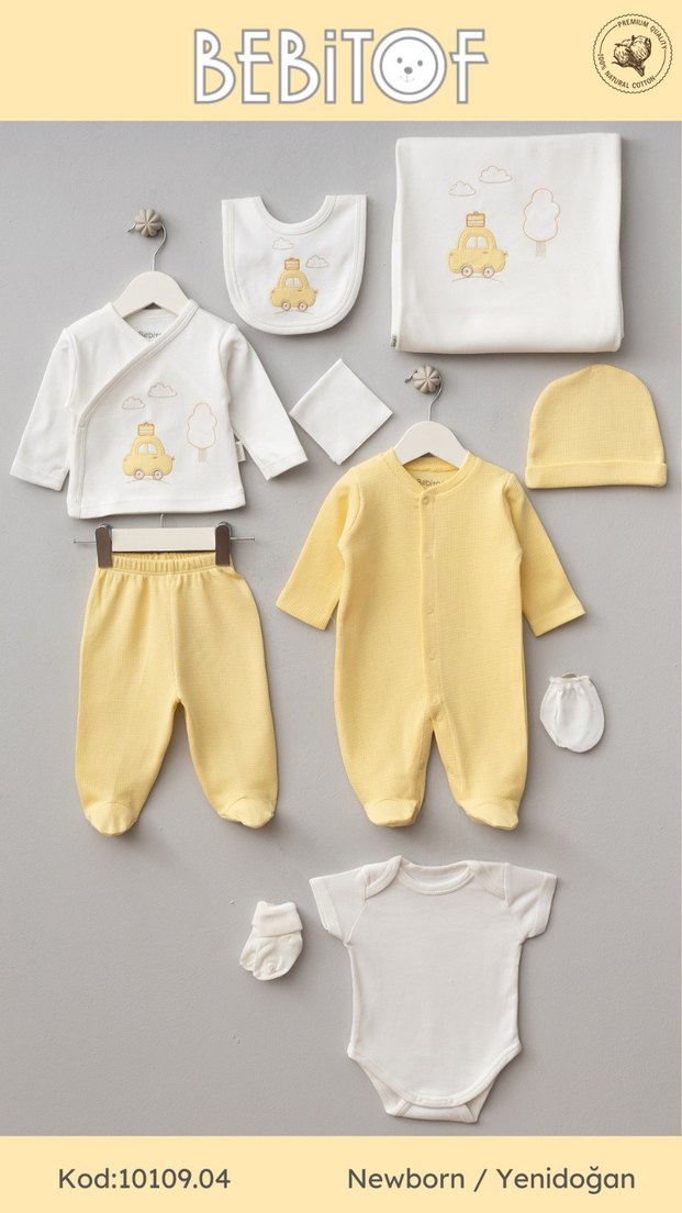 Yumuşak pamuktan yapılmış, nakış detaylı ve kısa kollu açık sarı bebek erkek kıyafet seti. Çoklu parça ile çeşitli kombinler yapılabilir.