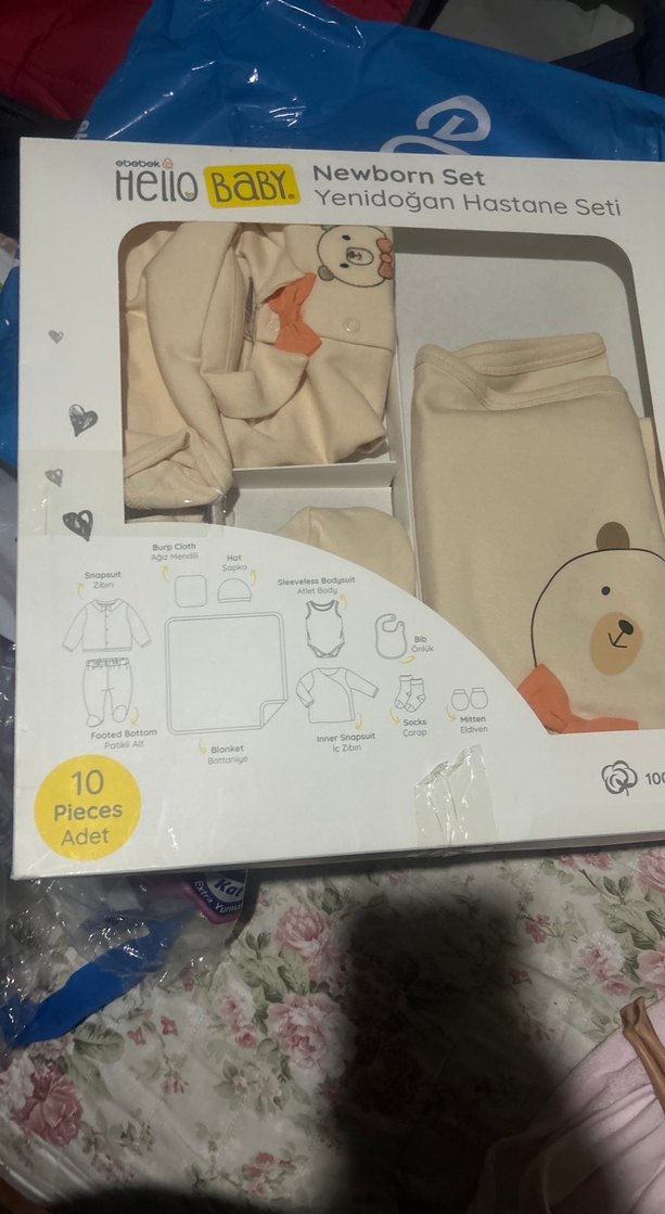 10 parçadan oluşan yenidoğan hastane seti, bej renkte ve ayı desenli, yumuşak ve sıcak kumaştan üretilmiştir.
