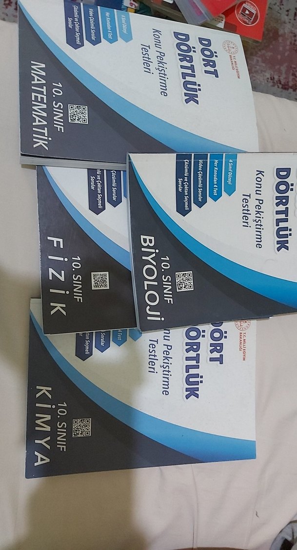 10. sınıf için Matematik, Kimya, Biyoloji ve Fizik konu pekiştirme testleri içeren Dörtlük serisi.Sadece biyolojiden birkaç test cözülmüstür.