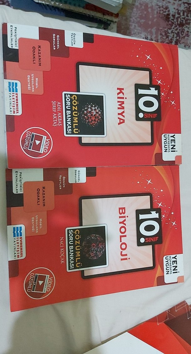 10. sınıf Kimya ve Biyoloji için kazanım odaklı, çözümlü soru bankası seti. Yeni müfredata uygun, sınav hazırlığına destek sağlar.İki kitaptanda iki üc test cözülmüstür.Tanesinin fiyati 70 tldir.
