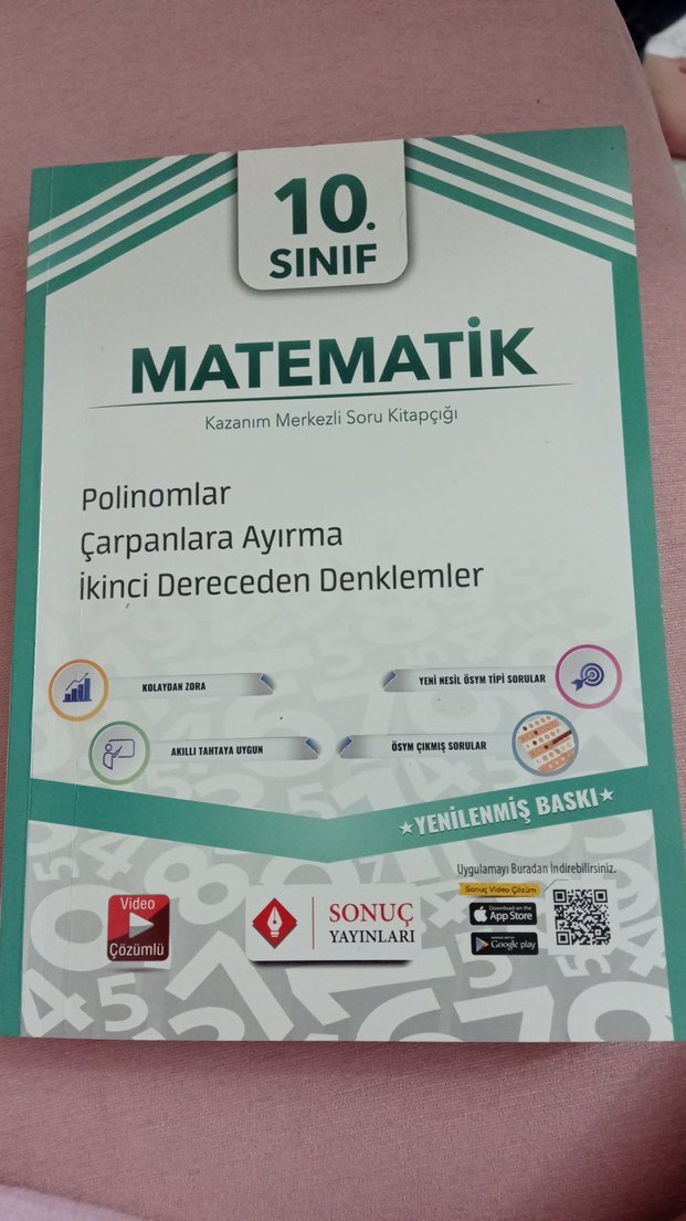 10. sınıf matematik kazanım merkezli soru kitabı, polinomlar, çarpanlara ayırma ve ikinci dereceden denklemler konularını içerir. Video çözümleri ve yenilenmiş sorular sunar. 5 sayfa felandır toplam zaten fotoğrafa koydum kitap temizdir