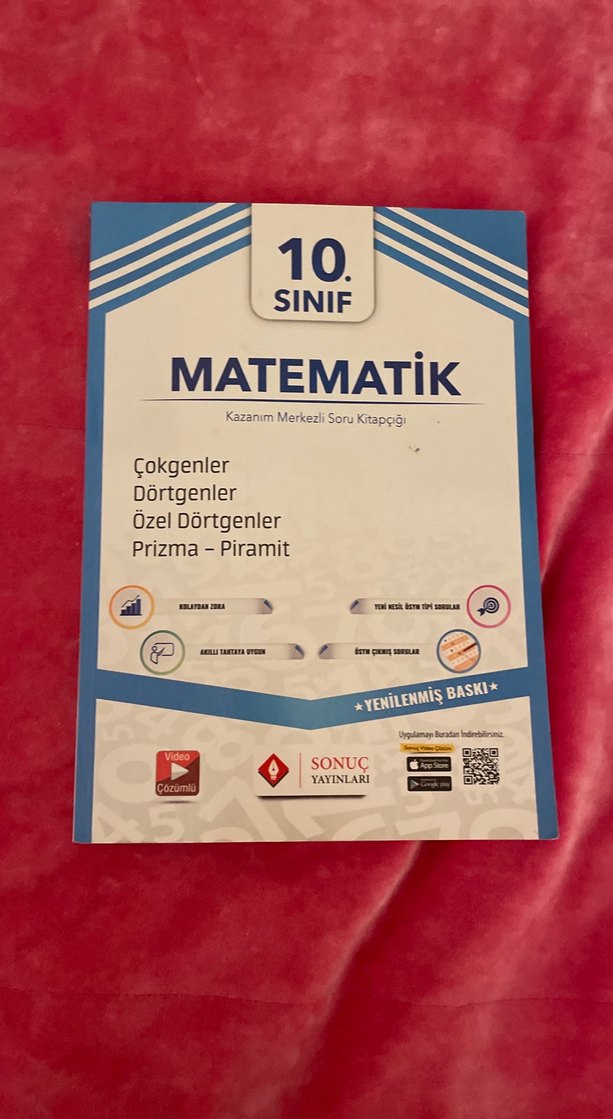 10. sınıf matematik kitabı çokgenler, dörtgenler, özel dörtgenler ve prizma-piramit konularını içerir. Yenilenmiş baskı ve video çözümleri mevcuttur. Kitap 239 sayfa 20 sayfasi cozulmustur. Temiz kullanildi