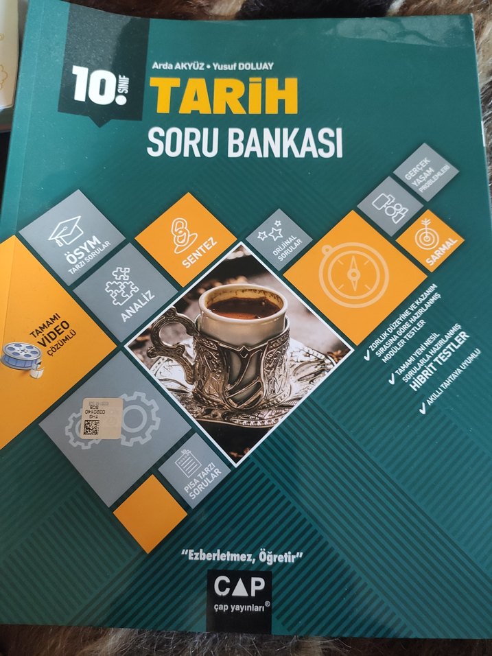 10. sınıf tarih soru bankası, video çözümleri, analiz, sentez ve çeşitli test türleri içerir. Çap Yayınları'ndan.