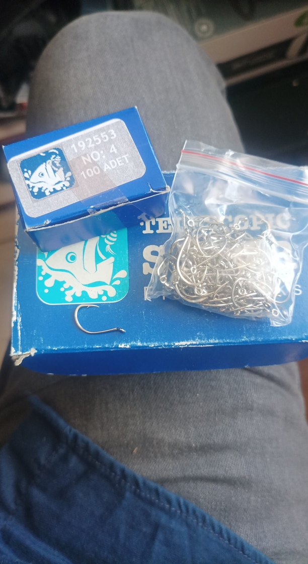 100 adet gümüş renk balıkçı kancası, mavi kutuda ve küçük poşette paketlenmiş şekilde sunulmaktadır.