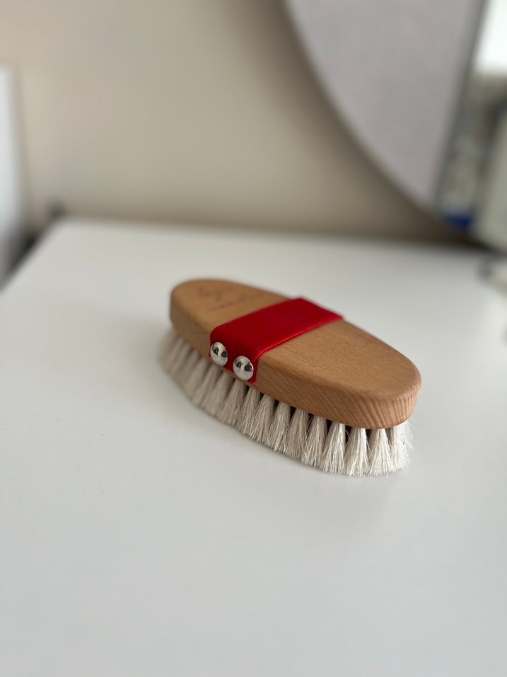 Ahşap saplı ve yumuşak beyaz kıllara sahip, rahat tutuş için kırmızı bant bulunan at kılı fırçası. ️