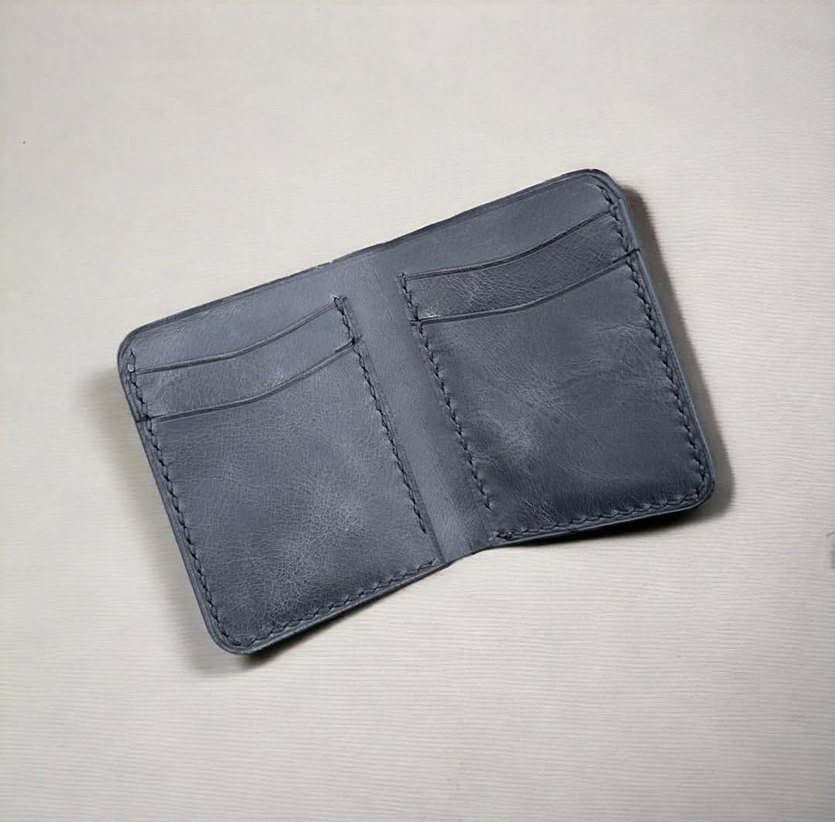 Gri renkte, desen içermeyen minimalist erkek cüzdanı. Biker tarzında, çoklu kart bölmeleri bulunur.