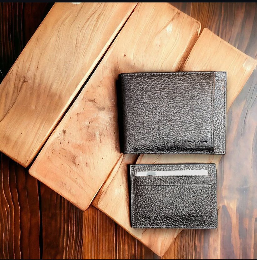 Minimalist tarzda, kahverengi, desen içermeyen erkek cüzdanı. Şeffaf kart bölmeli kartlık ile birlikte.